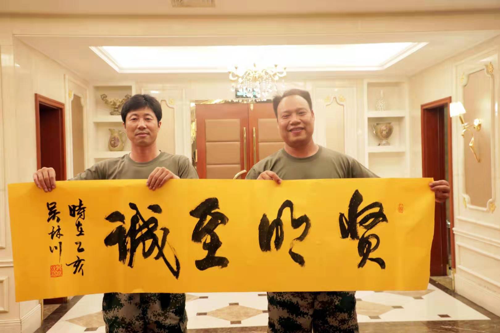 吴林川为打靶第一名获得者胡涛送上亲手誊写的字幅